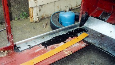 On peut raisonnablement penser que c'est du vrai bricolage ... en effet il vaut mieux apprendre à souder, et faire les choses dans les règles de l'art. Mais bon, j'avais commencé, ... j'ai été jusqu'au bout. Je ne sais toujours pas souder et surtout je n'ai pas de poste à soudure. Comme vous l'avez vu plus haut, il y avait pas mal de rouille et surtout, évidemment, dans des endroits complètement inaccessibles. J'ai toujours veillé à ne jamais mettre une tôle sur une autre, même peinte, sans intercaler une couche de goudron. En effet j'ai peur que l'eau stagne par capilarité entre les deux tôles qui se touchent. Je croyais, naïvement, qu'il suffit de poser une plaque de goudron sur la tôle, en la chauffant au chalumeau ... que ça va bien coller, qu'il n'y aura pas de vide ... Ben non, les tôles ne sont pas toujours plates, le goudron varie en épaisseur, etc. Je l'ai fait uniquement pour le plancher plat avant, sous les pieds, intérieur et extérieur. Comment faire pour enrober, au plus serré, les marche-pieds d'une tôle ? J'avoue avoir passé pas mal de temps à les comtempler, perplexe, à imaginer toutes sortes de stratagèmes. J'avais accès, à mon boulot, à une plieuse. mais comment plier une tôle en escargot ? Et surtout comment l'"enfiler" sur les marche-pieds sans la redéplier ? Je ne voulais pas non plus le faire en deux morceaux avec un joint sur le dessus ... C'est pas joli et surtout pas étanche.En plus, comme le dessous de la caisse était assez mal en point je voulais réaliser un beau pansement étanche par en dessous, ce jusqu'au renfort à 10 cm de l'arête.Tout ça en y versant du goudron chaud ... Voyons tout ça en photo.
