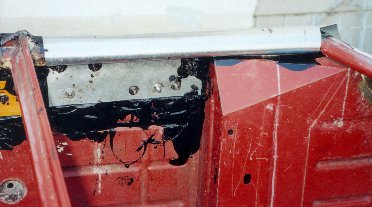 On peut raisonnablement penser que c'est du vrai bricolage ... en effet il vaut mieux apprendre à souder, et faire les choses dans les règles de l'art. Mais bon, j'avais commencé, ... j'ai été jusqu'au bout. Je ne sais toujours pas souder et surtout je n'ai pas de poste à soudure. Comme vous l'avez vu plus haut, il y avait pas mal de rouille et surtout, évidemment, dans des endroits complètement inaccessibles. J'ai toujours veillé à ne jamais mettre une tôle sur une autre, même peinte, sans intercaler une couche de goudron. En effet j'ai peur que l'eau stagne par capilarité entre les deux tôles qui se touchent. Je croyais, naïvement, qu'il suffit de poser une plaque de goudron sur la tôle, en la chauffant au chalumeau ... que ça va bien coller, qu'il n'y aura pas de vide ... Ben non, les tôles ne sont pas toujours plates, le goudron varie en épaisseur, etc. Je l'ai fait uniquement pour le plancher plat avant, sous les pieds, intérieur et extérieur. Comment faire pour enrober, au plus serré, les marche-pieds d'une tôle ? J'avoue avoir passé pas mal de temps à les comtempler, perplexe, à imaginer toutes sortes de stratagèmes. J'avais accès, à mon boulot, à une plieuse. mais comment plier une tôle en escargot ? Et surtout comment l'"enfiler" sur les marche-pieds sans la redéplier ? Je ne voulais pas non plus le faire en deux morceaux avec un joint sur le dessus ... C'est pas joli et surtout pas étanche.En plus, comme le dessous de la caisse était assez mal en point je voulais réaliser un beau pansement étanche par en dessous, ce jusqu'au renfort à 10 cm de l'arête.Tout ça en y versant du goudron chaud ... Voyons tout ça en photo.