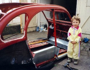 David, le fils de Suzanne et Alain. Voici la tôle positionnée pour l'arrière droit. C'est de la tôle galvanisée que j'ai trouvée chez Emmaüs. Ce devait être une grosse gaine de ventilation rectangulaire. Quatre morceaux, avec les bonnes pliures au bons endroits ... le tout pour 60F. Le gars chez Emmaüs devait me croire un peu fou pour acheter ce "truc", ... comme il l'a indiqué sur la facture.